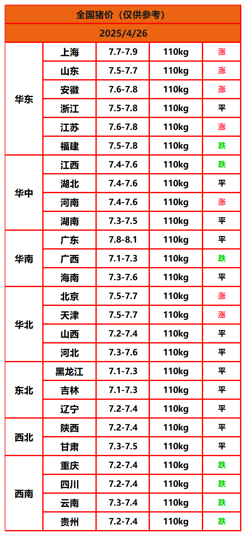 2025年4月26日猪价,今日全国猪价行情走势:7涨12平7跌。