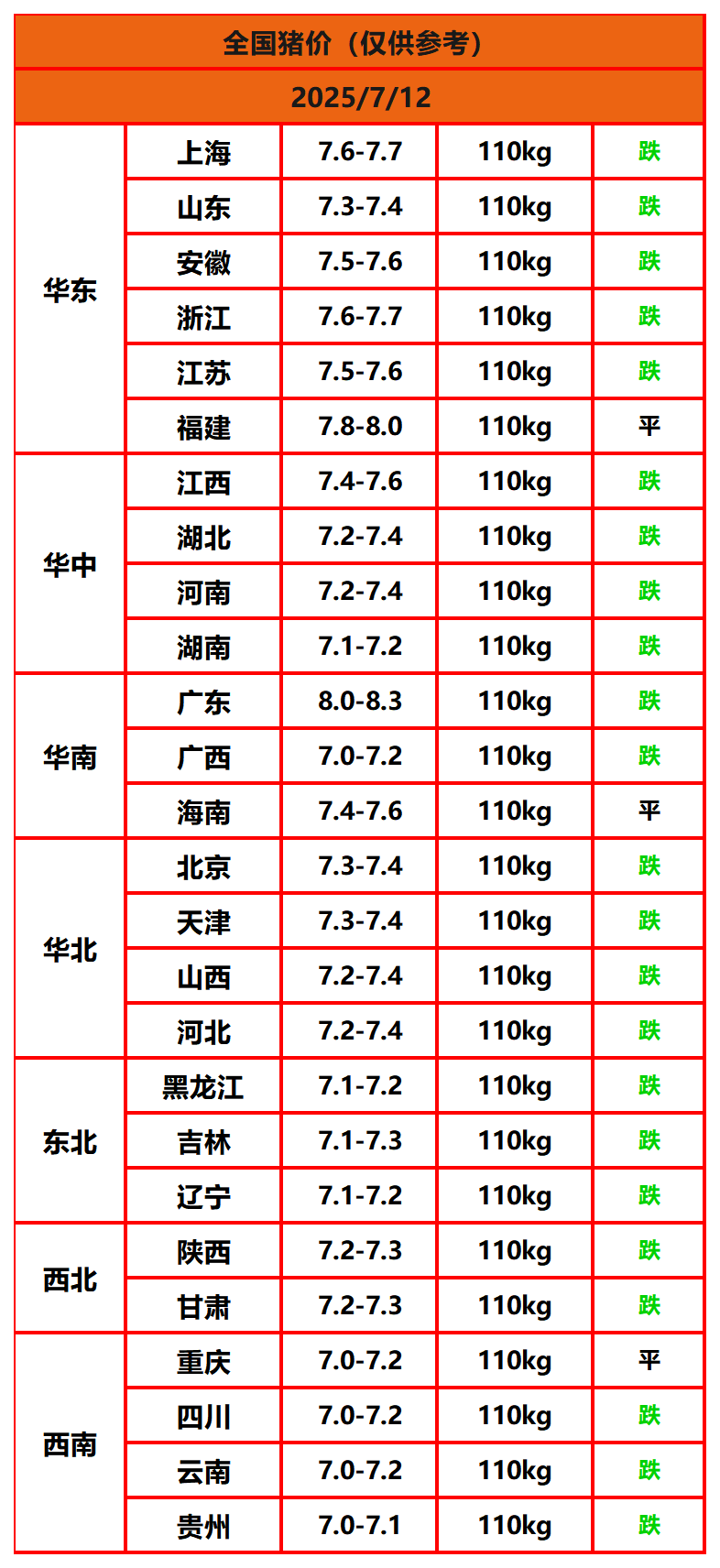 2025年7月12日猪价,今日全国猪价行情走势:0涨3平23跌。