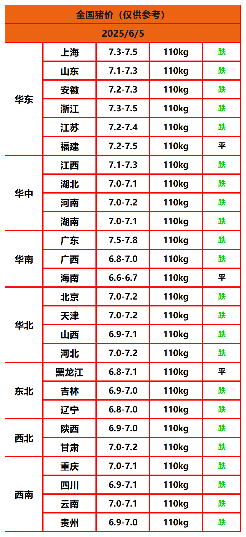 2025年6月5日猪价,今日全国猪价行情走势:0涨3平23跌。
