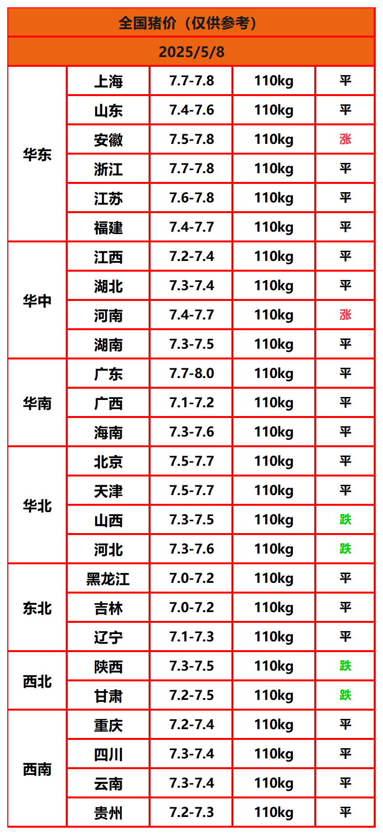2025年5月8日猪价,今日全国猪价行情走势:2涨20平4跌。