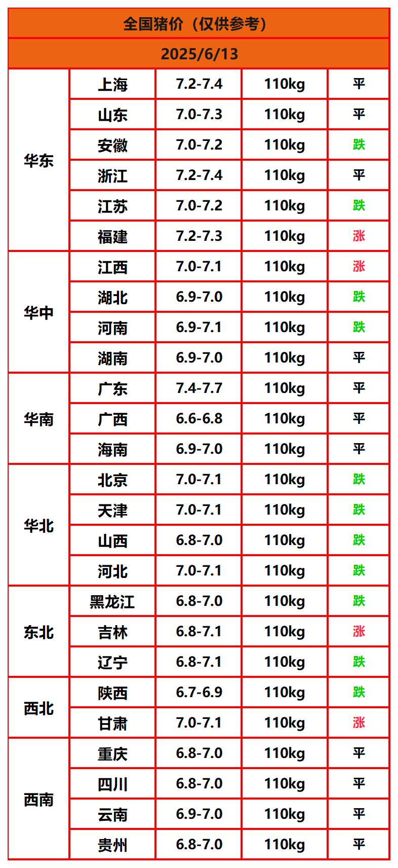 2025年6月13日猪价,今日全国猪价行情走势:4涨11平11跌。